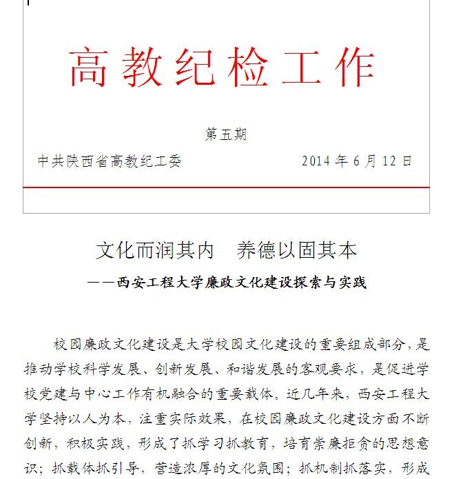 近日,我校的《文化而润其内,养德以固其本——西安工程大学廉政文化建设探索与实践》被省高教纪工委主办的《高教纪检工作》第五期全文刊发。